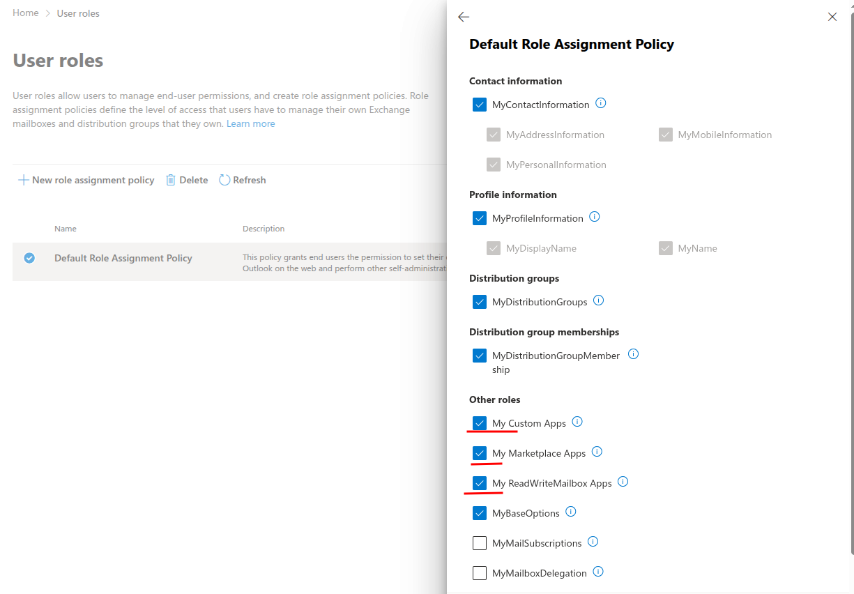 “My Custom Apps” “My Marketplace Apps” and “My ReadWriteMailboxApps” seçeneklerinin tikini kaldırın. Bu işlem, etkilenen tüm yönetici olmayan kullanıcılar için Outlook eklentileri seçeneğini devre dışı bırakacaktır.